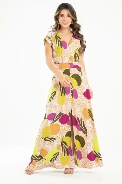 En Tejido Plano Estampado Escote en V Con Falso Botonado al Beso Con Botones de Pata 18 L Manga Corta Rodada Con Guardapolvo en Ruedo Asentado Con Pespuntes Almilla Delantera Con Recogido Suave y Parejo Fajón en Cintura Con Recogido.