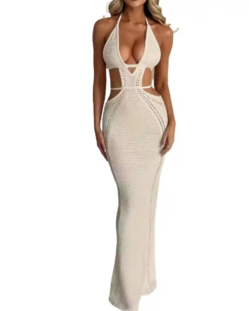 TALLA S ✔️ Color: Beige / crema ✔️ Diseño: Largo tejido tipo crochet ✔️ Escote: Profundo halter ✔️ Detalles: Aberturas laterales en cintura ✔️ Fit: Ajustado al cuerpo ✔️ Estilo: Elegante, sexy y playero