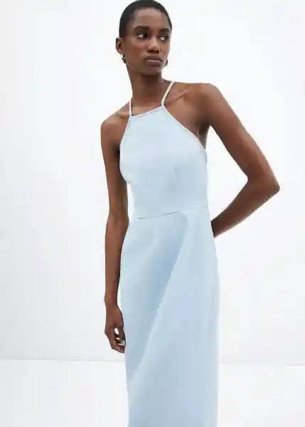 Abertura Posterior en el Bajo Cierre Cremallera Invisible en el Lateral Cuello Halter Diseño Midi Diseño Recto Sin Mangas Tejido de Algodón Estilo Tejano Vaquero Tirantes Finos Ajustables - 67070422_Tc.