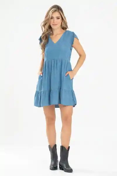 En Denim 100% Tencel Cuello en V Manga Corta Con Vuelo Bolero Decorativo en Ruedo Tono Medio.