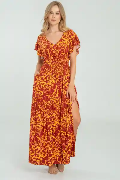 Largo en Chalis Estampado Escote en V Manga Bolero Corta Ajusta en Cintura Con Elásticos de 1 cm Sesgos Decorativos Bolsillos Laterales.