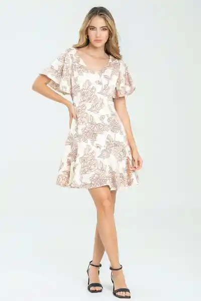 En Satín Estampado Escote en V Manga Corta Campana Ajusta en Busto y Cintura Falda Con Bolero.