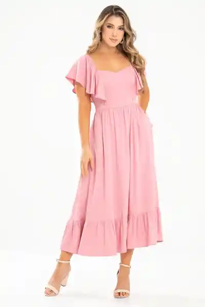 Midi en Tejido Plano Fondo Entero Elástico de 1 cm en Hombro Manga Corta Que va Casi Hasta el Corte de la Cintura Cierre Semi Invisible Tono a Tono en Costado Bolsillos en Los Laterales de la Falda Bolero en Ruedo Silueta Semi Ajustada.