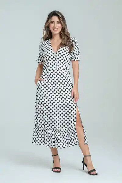 Midi en Tejido Plano Estampado Escote en V Botona en la Parte Delantera Con Botón de Pata Manga Corta Con Elástico en Puño Corte en Cintura Cierre Semi Invisible en el Costado Izquierdo Corte Con Abertura en la Parte Delantera.