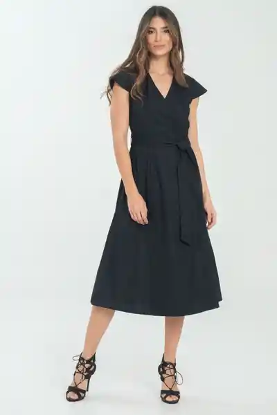 Midi en Tejido Plano Fondo Entero Escote Con Piezas Cruzadas Manga Corta Casquito Con Ruedo de 0.5 mm Corte en Cintura Pasadores y Cinturón en la Misma Tela Bolsillos en Los Laterales de la Falda Silueta Semi Ajustada.
