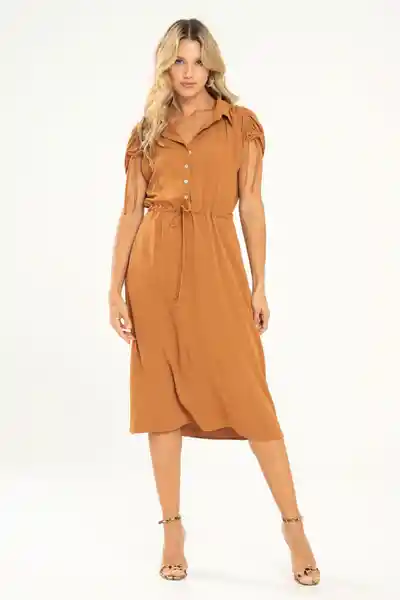 Midi en Cupro Fondo Entero Cuello Camisero Con Perilla Corta y Botones Manga Sisa Rodada Con Recogido en Hombros y Tira Para Ajustar Corte en Cintura Con Túnel y Tira Para Ajustar Forro Interno en Chalis Fondo Entero.