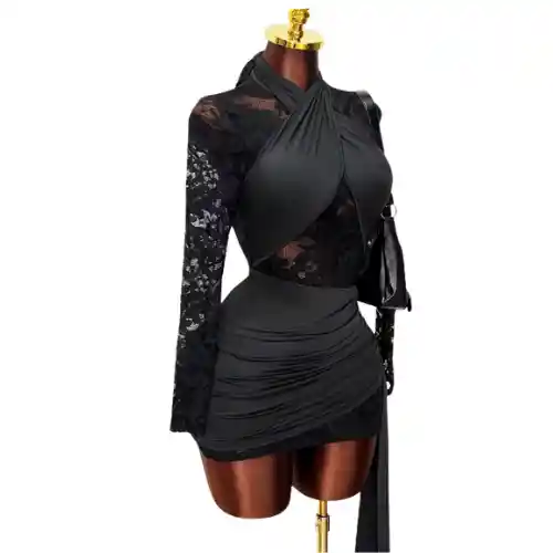 Vestido mini bodycon de moda con cuello halter, manga larga, color liso y ribete de encaje elástico | Detalle de encaje sexy en contraste, corte elegante y ajustado, perfecto para primavera/otoño. TALLA S