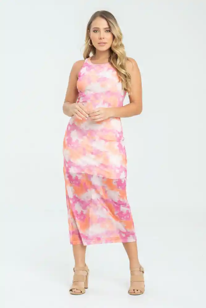 Vestido en mesh forrado, escote redondo, manga sisa, abertura lateral, silueta semi ajustada,