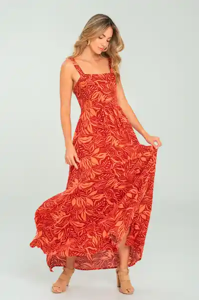 Largo en Chalis Estampado de Tiras Escote Recto Resortado en Laterales Bolsillos en Los Laterales de la Falda y Aberturas Decorativas.