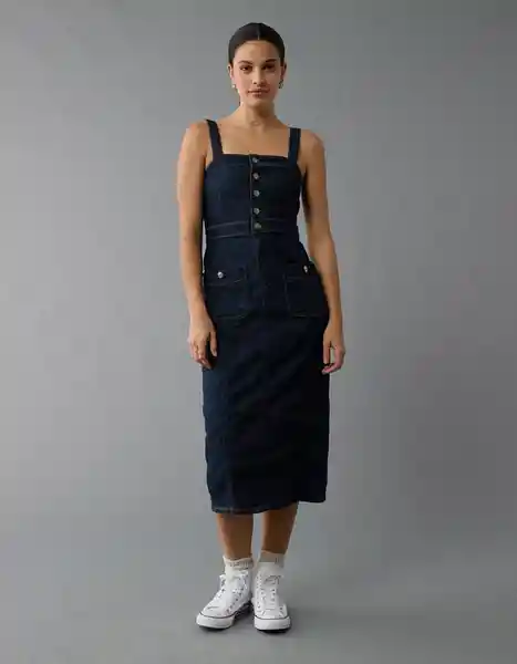 Denim Suave y Ligero Con un Toque de Elasticidad. Cuello Cuadrado Botones Frontales Con Cierre de Cremallera Bolsillos Delanteros Con Parche.