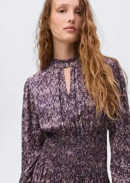 Cierre de Botón en la Parte Posterior Cuello Redondo Fruncido Detalle Abertura Circular en el Pecho Diseño Corto Diseño Evasé Estampado Étnico Manga Larga Con Puños Elásticos y Fruncidos Panel Fruncido en la Cintura Tejido de Lúrex Tejido Fluido - 17077121_65.