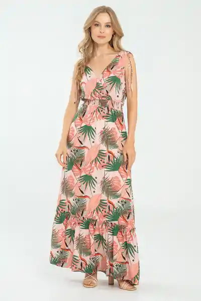 Largo en Chalis Estampado Escote Cruzado Con Recogido en Hombro Manga Sisa Cintura Resortada Bolero en Ruedo.