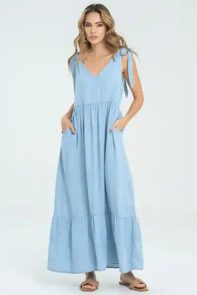 En Denim Liviano Fondo Entero Escote en V en Frente y Espalda Detalle de Anudado en Hombros Bolsillos Laterales Bolero en Ruedo.