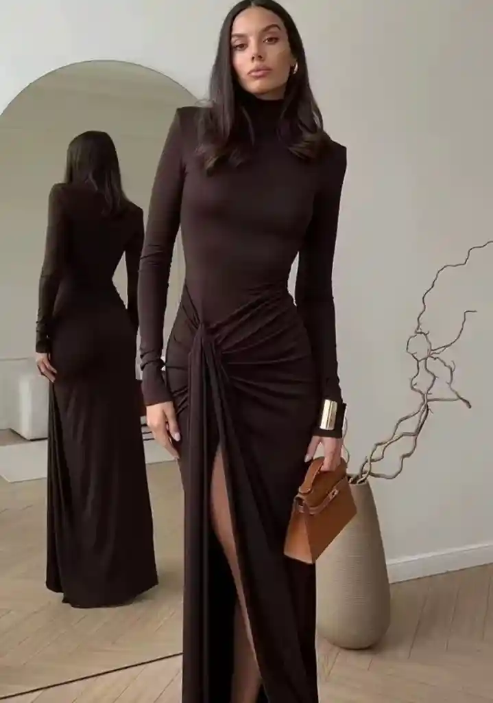 Vestido Orléane El Vestido Orléane es la definición de elegancia segura y sensualidad sutil. Su silueta ajustada realza el cuerpo de forma natural, mientras el drapeado frontal con abertura lateral aporta movimiento, sofisticación y un toque seductor sin esfuerzo. El cuello alto y las mangas largas equilibran perfectamente el diseño, convirtiéndolo en una pieza atemporal que estiliza y alarga la figura. Ideal para ocasiones especiales, cenas elegantes o eventos donde quieres destacar con una presencia fuerte y femenina. Un vestido pensado para mujeres que saben que menos es más, y que la seguridad es el mejor accesorio. Detalles: Silueta ajustada que realza la figura Cuello alto y mangas largas Drapeado frontal con abertura lateral Largo maxi Tela suave, elástica y cómoda Diseño elegante y versátil ✨ Perfecto para combinar con tacones minimalistas y accesorios protagonistas.