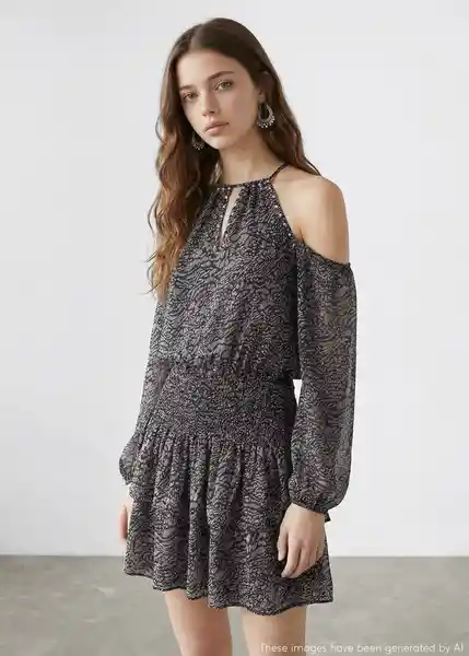 Cierre de Botón en la Parte Posterior Cintura Elástica Tipo Nido de Abeja Cuello Halter Cut-Out Detalle de Abertura Detalle de Tachuelas Diseño Corto Diseño Estampado Diseño Evasé Forro Interior Hombros Descubiertos Manga Larga Abullonada Puños Elásticos Tejido de Gasa Volantes en la Falda - 27083739_56.