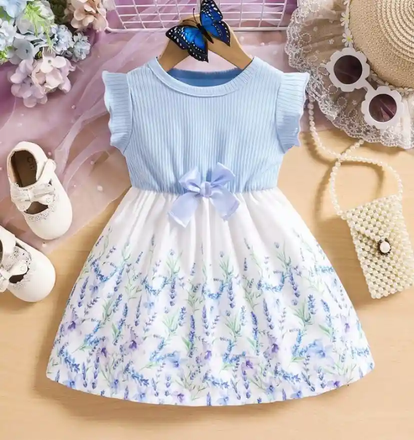 Vestido de fiesta azul con moño y flores, ideal para fotos, cumpleaños o eventos. Tela suave, cómoda y fácil de lavar. Perfecto para bebés que aman moverse con libertad.