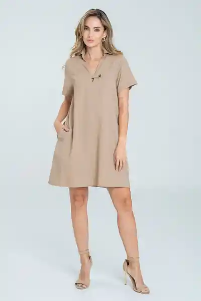 Corto Fondo Entero en Tejido Plano Cuello Camisero Con Banda Escote en V Con Charretera Manga Corta. Bolsillos Laterales Corte en Centro Espalda.