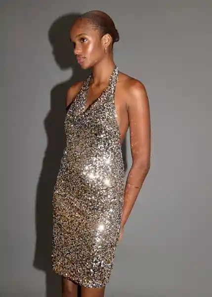 Cierre de Botones en el Cuello Colección Fiesta y Eventos Cuello Halter Diseño Corto Diseño Recto Escote Drapeado Espalda Abierta Forro Interior Tejido de Lentejuelas - 17098631_Or.