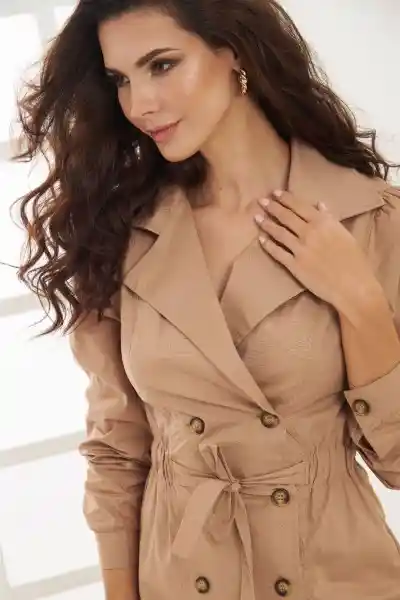 Corto Fondo Entero Popelina Cuello de Doblar Pespuntado Manga Larga Con Recogido Suave en Hombro Manga Larga Con Puño Botonado Elástico de 3 cm en Cintura Que Temina en Tiras Para Anudar en la Parte Delantera Silueta Semi Ajustada.