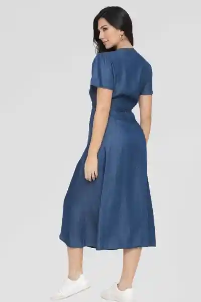 Largo Denim Liviano Fondo Entero Escote Cruzado Tira en Cintura Para Ajustar Corte en Cintura Manga Corta.