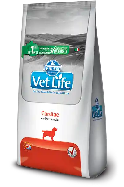 Alimento coadyuvante seco indicado para perros con insuficiencia cardíaca. Farmina Vet Life Natural Canine Cardiac es un alimento coadyuvante seco para perros indicado para el soporte de la función cardiaca en casos de insuficiencia cardíaca crónica. Modo de acción: La modificación de la relación Na/K favorece la compensación del desequilibrio de electrolitos promovidas por las enfermedades del corazón. El enriquecimiento con taurina y L-carnitina ayuda a la mejora de la función cardiaca. RESTRICCIONES Y OTRAS RECOMENDACIONES: Vet Life Natural Canine Cardiac está contraindicado para cachorros, hembras en gestación o lactancia y animales sanos.