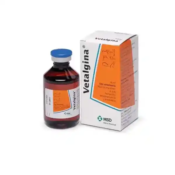 Vetalgina Fco x 50 mL Solución Inyectable. Analgésico Antipirético y Antiespasmódico Para Bovinos Equinos Porcinos Ovinos Caprinos y Perro
