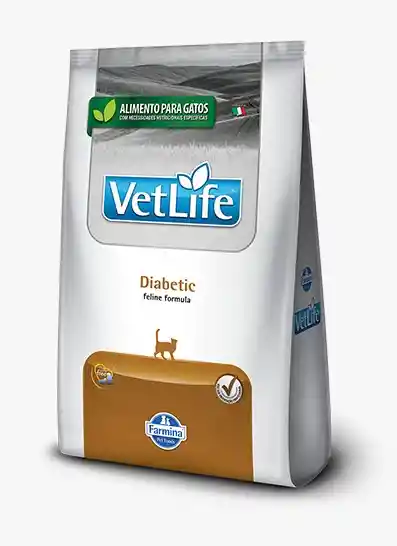 Alimento coadyuvante seco para gatos indicado en el control de la diabetes mellitus. Farmina Vet Life Natural Feline Diabetic es un alimento coadyuvante seco para gatos que ayuda a controlar la diabetes mellitus. Tiene bajos niveles de azúcar y almidón que ayudan en la reducción de la glucosa postprandial. RESTRICCIONES Y OTRAS RECOMENDACIONES: Vet Life Natural Feline Diabetic está contraindicado en la gestación, la lactancia, para gatitos en crecimiento y gatos con encefalopatía hepática o insuficiencia renal