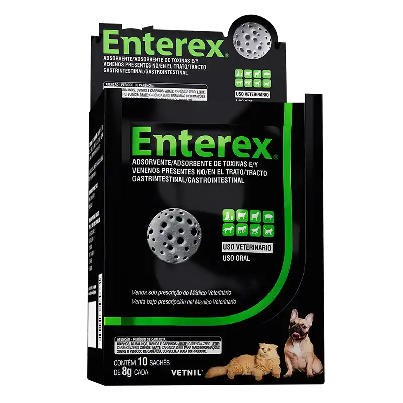 Adsorbente de toxinas y venenos presentes en el tracto gastrointestinal.Debe ser administrado a través de jeringa, o sonda, coadyuvante en diarreas.Vetnil enterex sobre, Para ser utilizado por vía oral, diluido en agua (40 ml). Enterex® está indicado como absorbente de toxinas y venenos, presentes en el tracto gastrointestinal de équidos, bovinos, bufalinos, caprinos, ovinos y porcinos, en los casos de envenenamientos, intoxicaciones diversas y auxiliar en diarreas y gastroenteritis.