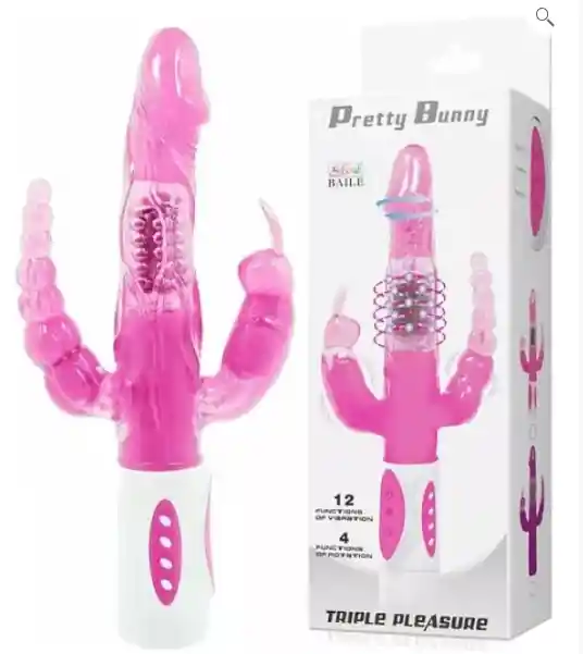 Conejo Vibrador Doble para estimula tres areas a la ves: Clitoris , Ano Y Vagina un trio de placer este Rabbit Vibrador Doble en ves de ser doble es triple por las zonas que estimula es seguro para la piel, sin ftalatos, sin látex, resistente al agua. Longitud: 22 CM Diámetro: 3 CM Insertable: 12 CM Función: vibración y rotación Velocidad de vibración: 12 velocidades Velocidad de rotación: 4 velocidades Material: TPE Impermeable: Sí “no sumergible” Baterías: 3 x AAA (No incluido)