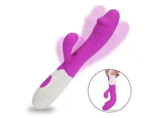 VIBRADOR PUNTO G - 10 VELOCIDADES - A PRUEBA DE AGUA VIBRADOR CON PILAS Descripción Vibrador Punto G es un vibrador para doble estimulación (vaginal y clítoris), ya que cuenta con estimulador de clítoris ubicado perfectamente para una fusión de felicidad interna y externa que te dejara temblando de alegría. Prepárate para las poderosas sensaciones de este lindo vibrador de conejo. Con un potente motor multivelocidad que proporcionará la estimulación por dentro y por fuera para los orgasmos mezclados alucinantes. Características: - Tamaño: 25,5 cms - Diámetro: 4 cms - Material: Silicona TPE - Color: Morado o fucsia o azul o negro - Carga: 2 pilas AA - Funciones: 10 Velodidades - A prueba de agua Cuidado y limpieza: Jabon suave o limpiador de juguetes. Confidencialidad: Tus pedidos se envían en una caja o sobre totalmente sellado opaco sin ningún tipo de marcas externas. Para nosotros es muy importante tu privacidad.