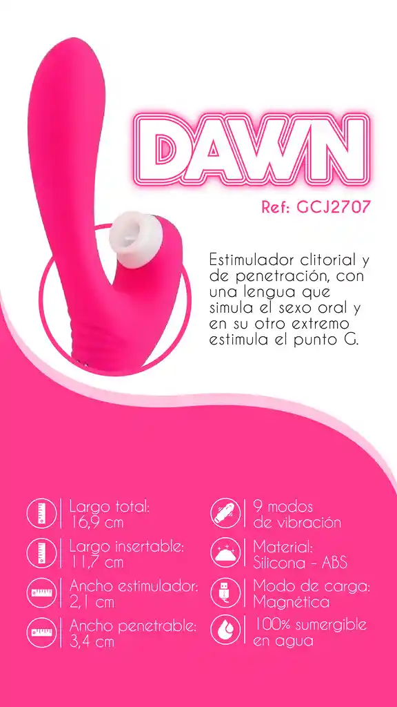 Dawn es un estimulador clitorial y de penetración. Activa sus 9 ritmos de vibración para disfrutar a solas o con tu pareja. Cuenta con una lengua que simula el sexo oral y en su otro extremo estimula el punto G. Largo total:16.9 cm Largo insertable:11.7 cm Ancho estimulador:2.1 cm Ancho penetrable:3.4 cm 9 modos de vibracón Material: Silicona + ABS 100% sumergible al agua Carga: Magnetica Cuidado y limpieza: Jabón suave o limpiador de juguetes