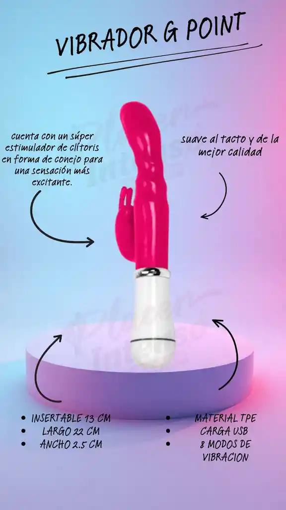 Vibrador que cuenta con una poderosa y revolucionaria vibración, suave al tacto y de la mejor calidad, por si fuera poco, cuenta con un súper estimulador de clítoris en forma de conejo para una sensación más excitante. CARACTERÍSTICAS: MATERIAL TPE CARGA USB 8 MODOS DE VIBRACION INSERTABLE 13 CM LARGO 22 CM ANCHO 2.5 CM COLORES A DISPONIBILIDAD *MORADO* *FUCSIA*