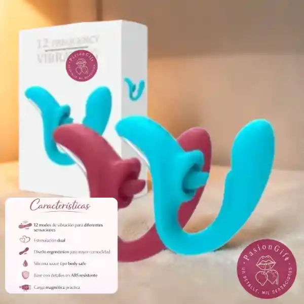 Vibrador íntimo diseñado para ofrecer estimulación dual y múltiples sensaciones, adaptándose al cuerpo gracias a su forma ergonómica. Su diseño permite estimular de forma simultánea el punto G y el clítoris, proporcionando una experiencia más completa. Fabricado en silicona suave tipo body-safe, brinda una sensación agradable al tacto y un ajuste cómodo. Sus 12 modos de vibración permiten explorar diferentes ritmos e intensidades para encontrar la estimulación que mejor se adapte a cada momento. Características: • 12 modos de vibración para distintas sensaciones • Diseño ergonómico para mayor comodidad • Estimulación dual interna y externa • Silicona suave tipo body-safe • Base con detalles en ABS resistente • Sistema de carga magnética Tipo de estimulación: • Estimulación interna del punto G • Estimulación externa del clítoris Especificaciones: • Largo total: 18 cm • Largo insertable: 11 cm • Diámetro máximo: 3.5 cm • Material: Silicona + ABS • Modos de vibración: 12 frecuencias • Sistema de carga: Magnética Recomendación de uso: Para una mejor experiencia se recomienda utilizar lubricante a base de agua y limpiar el producto antes y después de cada uso. Tipo: Vibrador íntimo recargable Distribuidor: PasionGift