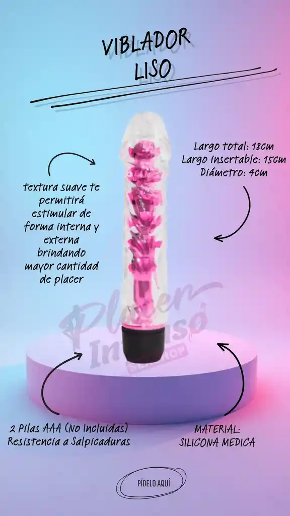 El vibrador PILOT es ideal para satisfacer tus más íntimas fantasías. Su textura suave te permitirá estimular de forma interna y externa brindando mayor cantidad de placer. Además de esto cuenta con una práctica rueda de multivelocidad de tal manera que puedas aumentar y disminuir la velocidad para un placer inigualable. CARACTERISTICAS Materia: Silicona Medicada Medidas: Largo total: 18cm Largo insertable: 15cm Diámetro: 4cm Baterías: 2 Pilas AAA (No Incluidas) Resistencia al agua: Salpicaduras RECOMENDACIONES: - Se recomienda utilizar con lubricantes a base de agua para tener una mejor experiencia y así mismo, prolongar la vida útil del producto. - La limpieza del producto debe realizarse antes y después de utilizar, con abundante agua tibia y jabón líquido, íntimo, de PH neutro.