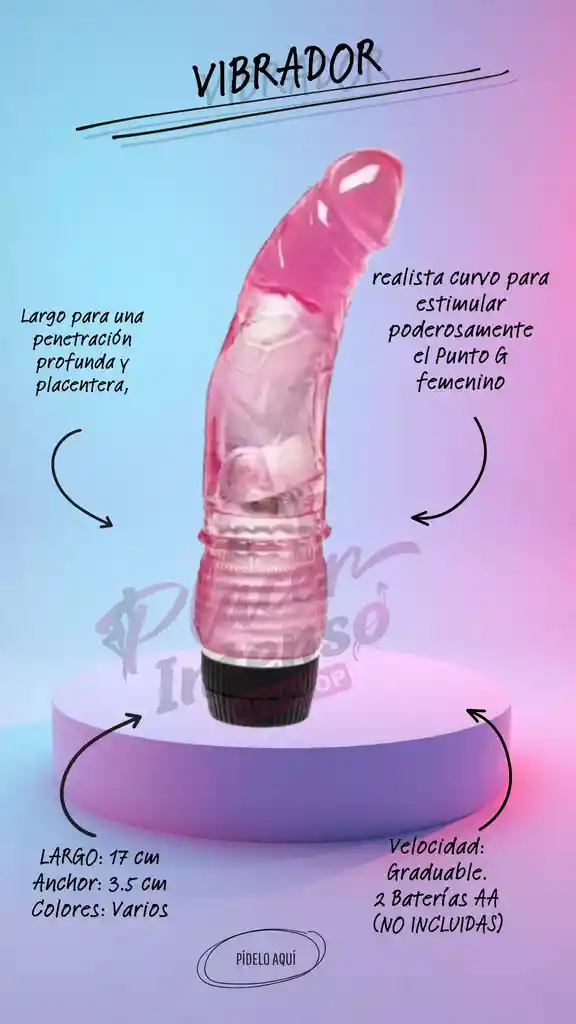 Largo para una penetración profunda y placentera, realista curvo para estimular poderosamente el Punto G femenino, se adapta a la forma natural del cuerpo. Ideal para estimular los puntos internos más sensibles. Atrévete a disfrutar de este pequeño amante que te brindara placeres y un éxtasis de satisfacción total, este vibrador cuenta con una textura suave diseñada para estimular es perfecto para principiantes y lo suficientemente potente como para adaptarse a cualquier nivel que desees. Las vibraciones son calmantes además su cabeza marcada y sus venas por todo el pene se siente muy real. Material: TPE LARGO: 17 cm Anchor: 3.5 cm Colores: Varios Velocidad: Graduable. Batería: AA*2 (NO INCLUIDAS)
