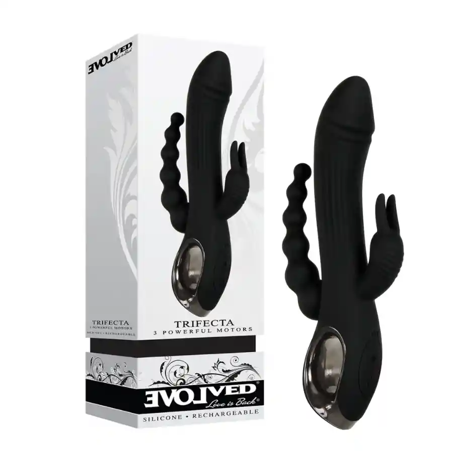 El Trifecta ofrece estimulación simultánea de tres zonas erógenas para una experiencia de placer única. Cada uno de sus tres ejes está equipado con su propio motor, asegurando una estimulación óptima en cada zona erógena. Solo se necesita encontrar el ritmo adecuado para disfrutar al máximo de sus poderosas vibraciones. Características: • Vibrador grande de triple estimulación • 10 potentes velocidades y funciones de vibración en cada motor • Altura: 21.6 cm, Profundidad: 9.1 cm, Ancho: 3.9 cm • Apunta a 3 zonas erógenas para orgasmos intensos • Eje principal de forma fálica con texturas controlado de forma independiente • Estimulador de clítoris con forma de conejo • Estimulador anal con cuentas graduadas • Panel de control de 3 botones fácil de usar • Hecho de silicona suave_Mango hecho de plástico ABS duradero • Resistente al agua. (Clasificación IPX7: protege hasta 1 metro de profundidad por no más de 30 minutos) • Batería recargable por medio de cable USB con pin magnético (Adaptador de corriente no incluido) • Peso: 201.3 gramos Garantía:1 Año Limpieza y cuidado: Es ideal que el uso de este juguete sea con lubricantes a base de agua. No se deben usar lubricantes de silicona. Limpiar antes y después de cada uso con un limpiador de juguetes y un paño suave que no desprenda material. Confidencialidad: Somos 100% discretos, tu envío llegará en una caja negra completamente envuelta.