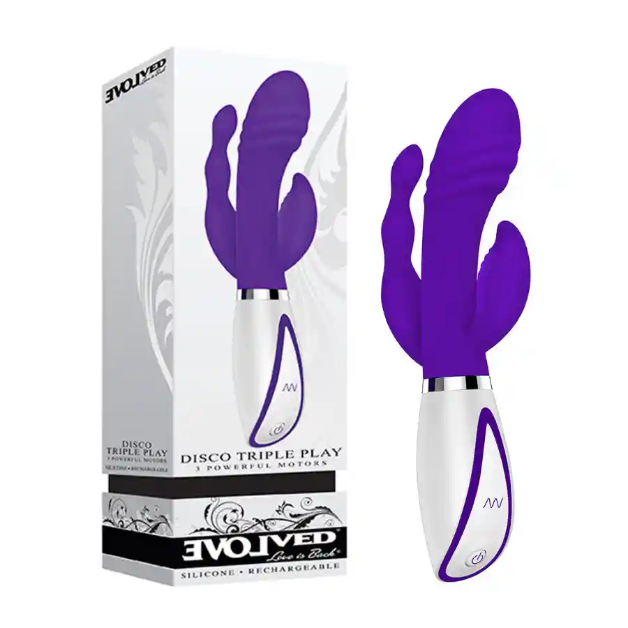 El Vibrador Triple Play Morado Evolved estimula clítoris, punto G y ano de manera simultánea para lograr el mayor clímax de la vida. Cuenta un solo botón de control para sus tres motores, que pueden funcionar a la vez o separados, para que explore la satisfacción completa de este trío de estímulos. Además, su segundo botón tiene 8 sorprendentes modos de vibración que generarán un cosquilleo en cada eje y podrá usarse en ducha o en baño, ya que, este juguete es completamente sumergible. Características: • Juguete de triple estimulación • 8 modos de vibración • Tres motores funcionales • Material: Silicona grado médico + ABS • Medidas: Longitud: 22, 2 cm. Longitud insertable: 12 cm. Diámetro: 4, 4 cm. • Longitud del estimulador de clítoris: 5, 1 cm • Longitud del estimulador anal: 8, 2 cm Diámetro del estimulador anal: 1, 9 cm • Batería recargable por medio de cable USB tipo plug (Adaptador de corriente no incluido) • Tiempo de carga: 2.5 horas • Tiempo de uso continuo: 45 – 120 minutos • Resistencia al agua: Ipx7: Resistente al agua. Protege hasta 1 metro de profundidad por no más de 30 minutos • Peso: 300 Gr Garantía: 1 año Limpieza y cuidado: Es ideal que el uso de este juguete sea con lubricantes a base de agua. No se deben usar lubricantes de silicona. Limpiar antes y después de cada uso con un limpiador de juguetes y un paño suave que no desprenda material. Confidencialidad: Somos 100% discretos, tu envío llegará en una caja negra completamente envuelta.