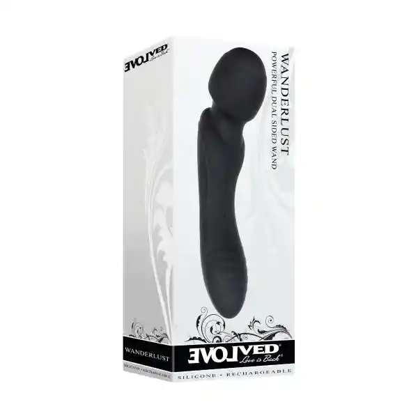 Vibrador Wanderlust Evolved Este juguete cuenta con dos excelentes funcionalidades, en un extremo cuenta con un masajeador tipo Hitachi, y en el otro tiene un vibrador con una leve curvatura. Sus botones de control, de fácil uso, ayudan a moverse entre las 49 combinaciones de funciones y velocidades ofrecidas por sus dos motores. Es el compañero de baño perfecto ya que es resistente al agua y completamente sumergible.