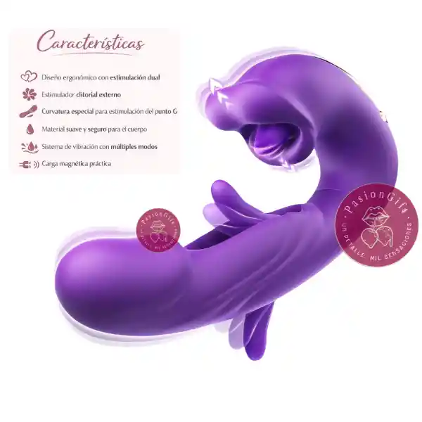 Vibrador íntimo diseñado para ofrecer estimulación dual, combinando estimulación interna y externa para una experiencia más completa. Su forma ergonómica y curvada permite adaptarse al cuerpo mientras estimula el punto G y el clítoris al mismo tiempo. Fabricado en silicona médica suave y flexible, proporciona una sensación agradable al tacto y un ajuste cómodo. Sus múltiples modos de vibración permiten explorar diferentes ritmos e intensidades según cada momento. Características: • Diseño ergonómico con estimulación dual • Estimulador clitorial externo • Curvatura especial para estimulación del punto G • Fabricado en silicona médica suave • Múltiples modos de vibración • Sistema de carga magnética Tipo de estimulación: • Estimulación interna del punto G • Estimulación externa del clítoris Especificaciones: • Largo total: 17 cm • Largo insertable: 13 cm • Diámetro aproximado: 4 cm • Material: Silicona médica • Modos de vibración clitorial: 10 • Modos de vibración punto G: 10 • Sistema de carga: Magnética Recomendación de uso: Para una mejor experiencia se recomienda utilizar lubricante a base de agua y limpiar el producto antes y después de cada uso. Tipo: Vibrador íntimo recargable Distribuidor: PasionGift
