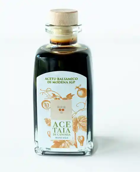 producto obtenido de la unión equilibrada de vinagre de vino y mostos de uva típicos totalmente cosechados en la región de Emilia Romagna. Una breve parada en barriles de madera lo hace particularmente agradable, especialmente en combinación con muchos alimentos.