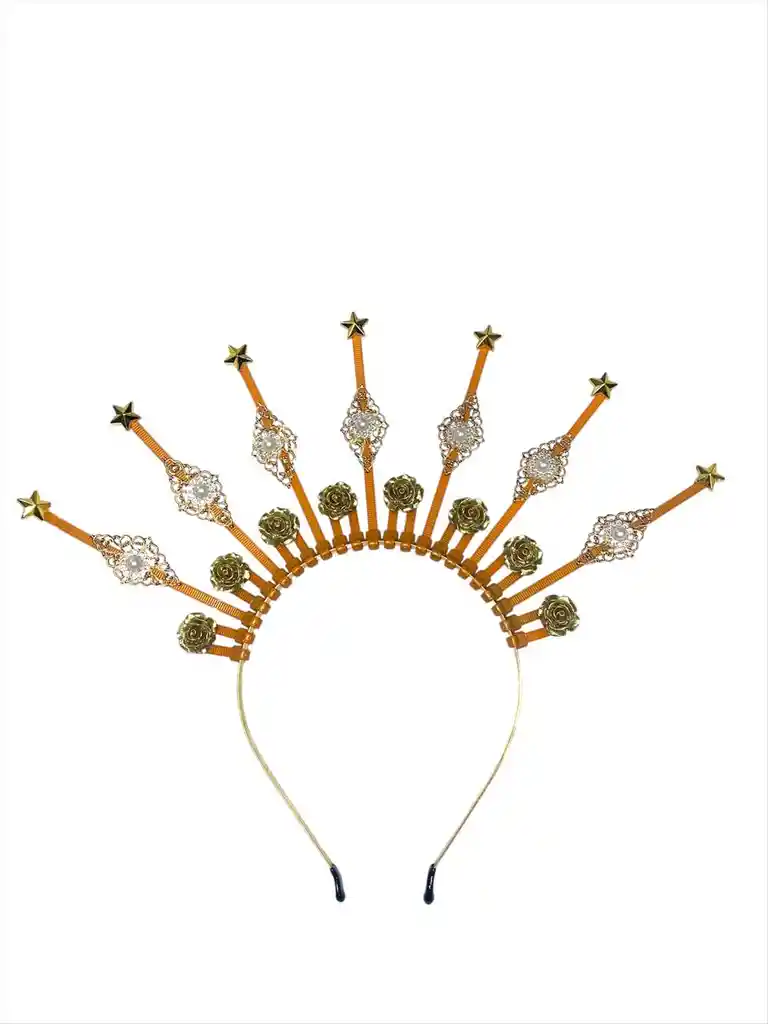 Diadema elegante ideal para fiestas, disfraces o celebraciones especiales. Diseño con estrellas y flores doradas que realzan tu look con un toque unico