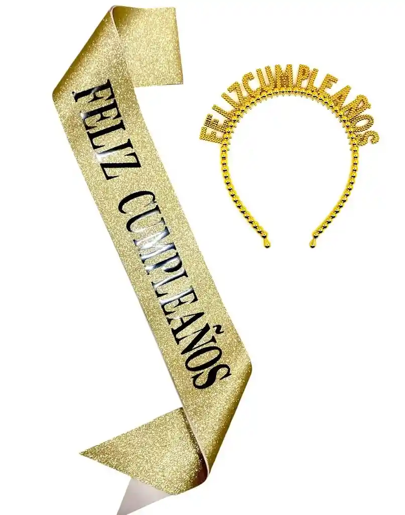 Vincha Diadema + Banda Feliz Cumpleaños Dorada