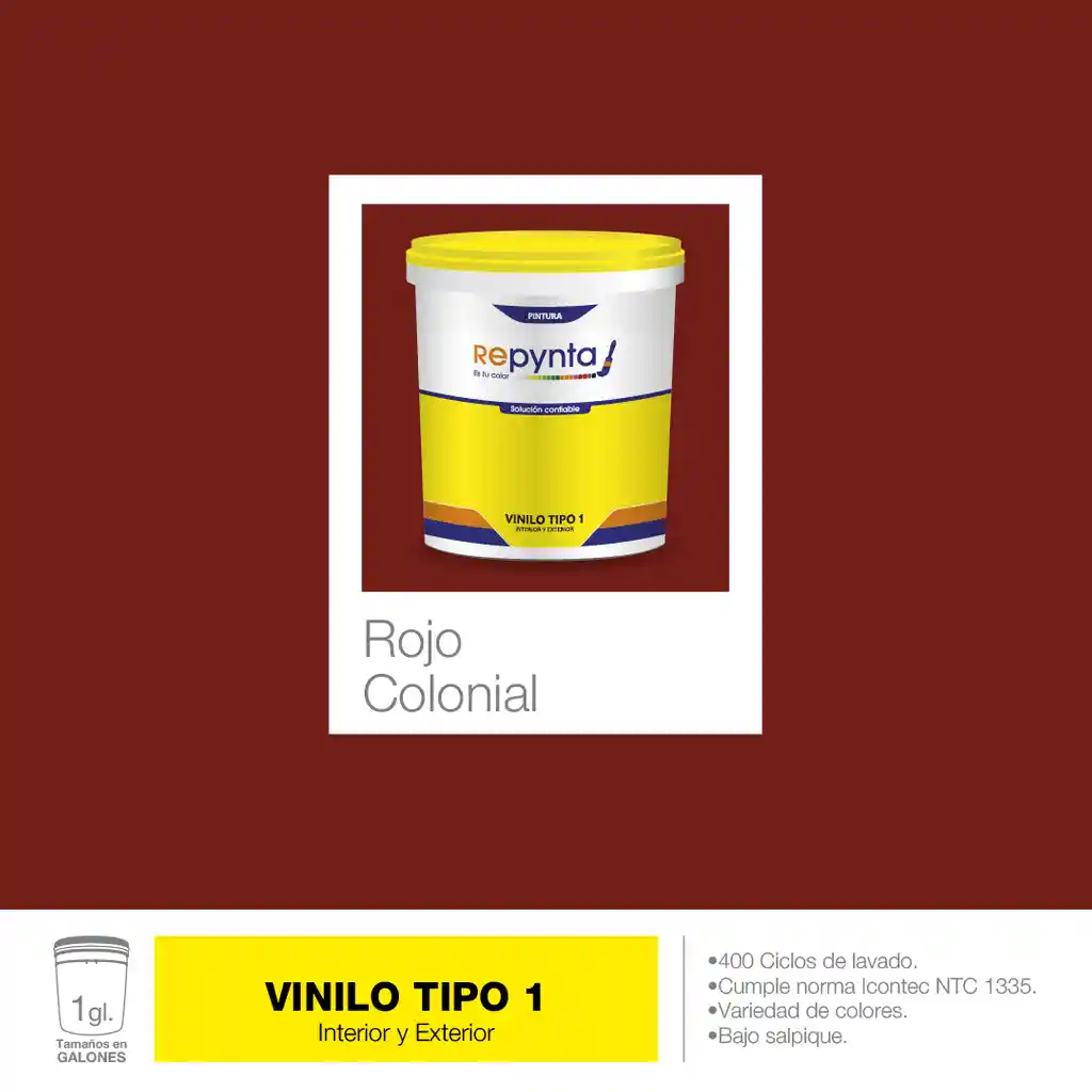 Vinilo Base Agua Tipo 1 Rojo Colonia (1 Galón) Repynta