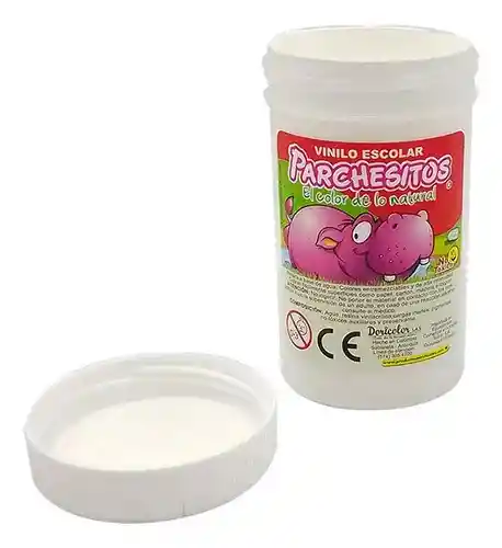 Tarro de vinilo blanco grande de 125 gr parchesitos están diseñados especialmente para ser usadas como producto didáctico (Uso escolar) en jardines infantiles, escuelas, colegios y en especial donde se necesite un producto de excelente acabado, suaves al aplicar, elaboradas a base de agua, brindan al niño rendimiento y poder cubrimiento, no deja grumos, no mancha la piel o la ropa. Tonos intensos, secado rápido, libre de metales pesados, no tóxico Usos: Pueden ser aplicados en superficies de cerámica, yeso, papel, cartón, corcho, icopor, asbesto, madera, etc.