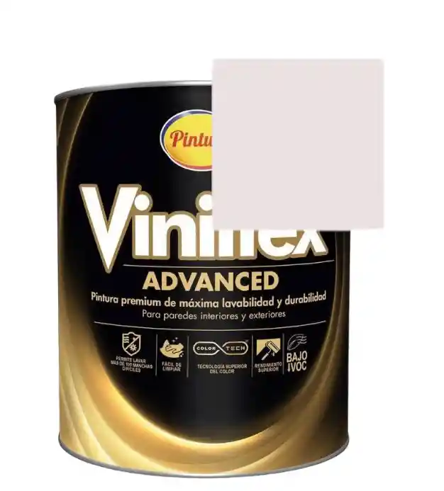 Recomendada para decorar y proteger muros y cielos rasos de residencias, oficinas, zonas de alto tráfico y edificaciones en general, en ambientes interiores y exteriores bajo sombra. Disponible en una amplia gama de colores. Viniltex Advanced es una pintura Tipo 1* diluible con agua, fabricada a partir de copolímeros Acrílicos. Cuenta con una emulsión siliconada que permite máxima lavabilidad, resistencia al frote sin desgaste por desprendimiento y alta resistencia a la formación de hongos. Producto formulado sin plomo ni cromo. Acabado mate.
