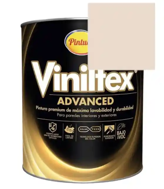Recomendada para decorar y proteger muros y cielos rasos de residencias, oficinas, zonas de alto tráfico y edificaciones en general, en ambientes interiores y exteriores bajo sombra. Disponible en una amplia gama de colores. Viniltex Advanced es una pintura Tipo 1* diluible con agua, fabricada a partir de copolímeros Acrílicos. Cuenta con una emulsión siliconada que permite máxima lavabilidad, resistencia al frote sin desgaste por desprendimiento y alta resistencia a la formación de hongos. Producto formulado sin plomo ni cromo. Acabado mate.