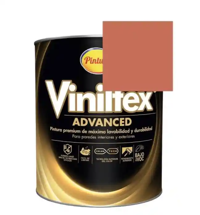 Recomendada para decorar y proteger muros y cielos rasos de residencias, oficinas, zonas de alto tráfico y edificaciones en general, en ambientes interiores y exteriores bajo sombra. Disponible en una amplia gama de colores. Viniltex Advanced es una pintura Tipo 1* diluible con agua, fabricada a partir de copolímeros Acrílicos. Cuenta con una emulsión siliconada que permite máxima lavabilidad, resistencia al frote sin desgaste por desprendimiento y alta resistencia a la formación de hongos. Producto formulado sin plomo ni cromo. Acabado mate.