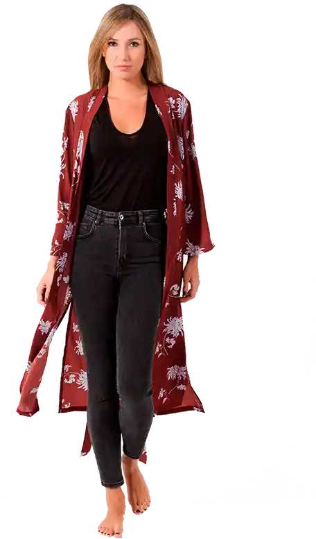 Kimono clásico largo, con cuello en V, manga larga, abertura a cada lado y cinturón removible de la misma tela que se cierra en la parte delantera. Tela tipo chalis con estampado de flores color blancas sobre fondo vinotinto. Talla Única