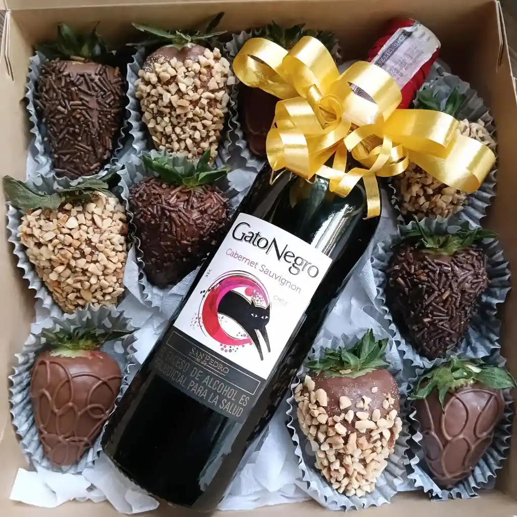 Un detalle romántico y lleno de sabor: exquisitas fresas frescas bañadas en chocolate, acompañadas de una botella pequeña de vino de 187 ml para brindar y disfrutar. Nota: Recuerda que al momento de hacer tu pedido, te escribiremos por el chat de rappi para conocer la temática y el mensaje personalizado que acompañara tu pedido.