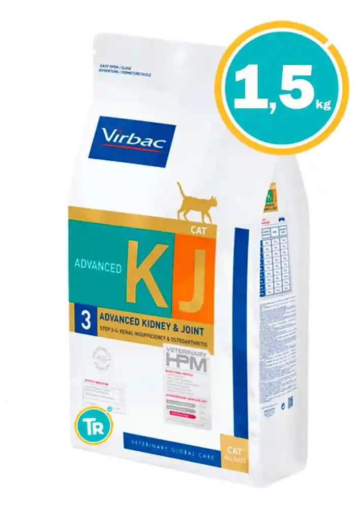 Veterinary HPM Kidney Joint para gatos es una alimentación dietética, apoyo de la función renal en caso de insuficiencia renal crónica en estadio IRIS 2 y apoyo al mantenimiento de la integridad de las articulaciones en caso de osteoartritis. Programa nutricional destinado a gatos que padecen ERC (Enfermedad Renal Crónica) y OA (osteoartritis). VENTAJAS Y PRINCIPALES CARACTERÍSTICAS Proteína de alta calidad (60% aminoácidos esenciales). Alta palatabilidad. Palatability plus complex. Alto nivel de EPA+DHA y (omega-3). Acción condroprotectora gracias al Complejo Mobility Plus. Bajo contenido de fósforo (0,7%) + Quitosán (quelante de fósforo). Puede combinarse con la dieta húmeda Early Kidney Joint. Virbac Kidney Joint (KJ2) Kidney Support (Insuficiencia Renal Articular) 1.5 kg cantidad 1 Añadir al carrito
